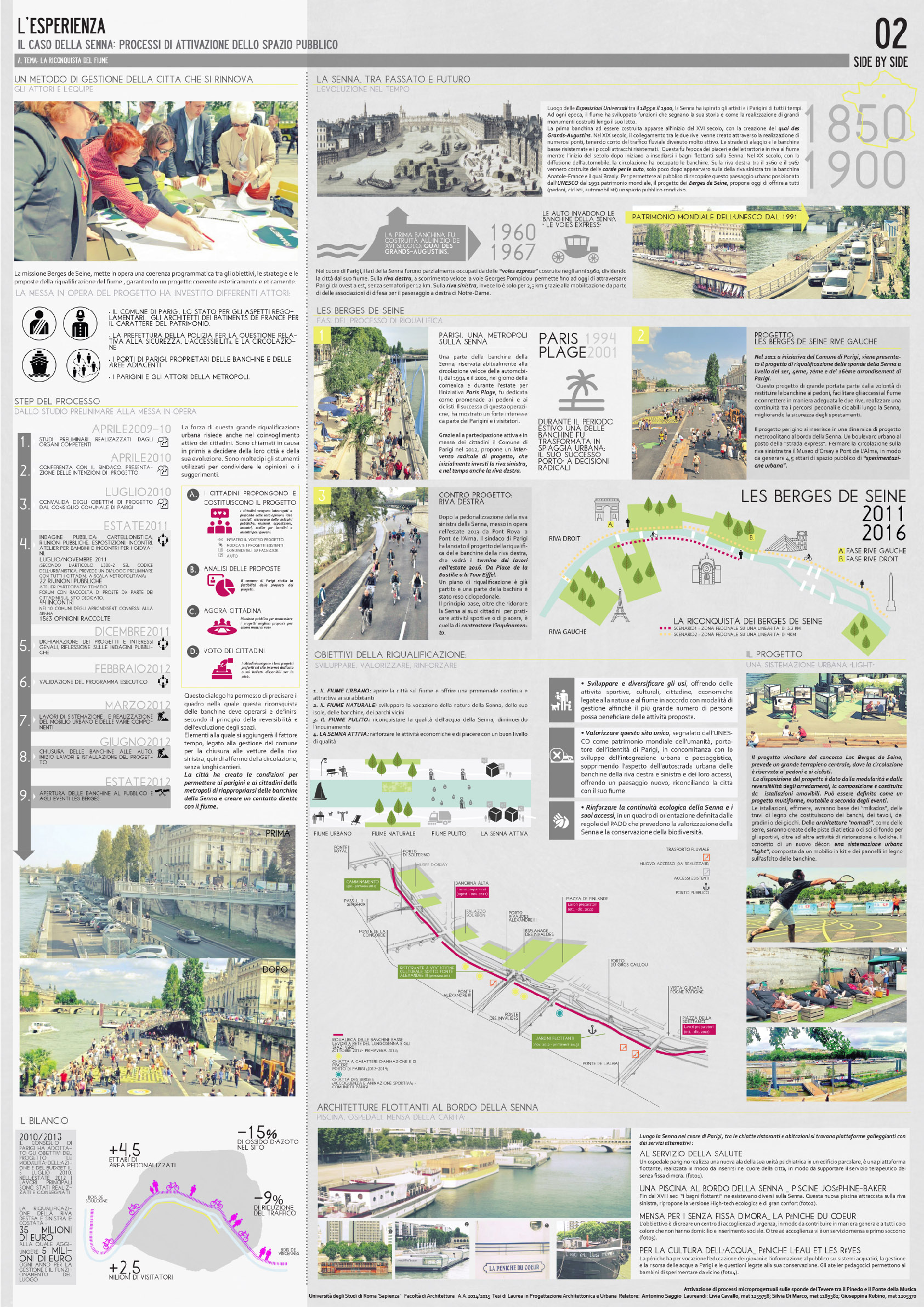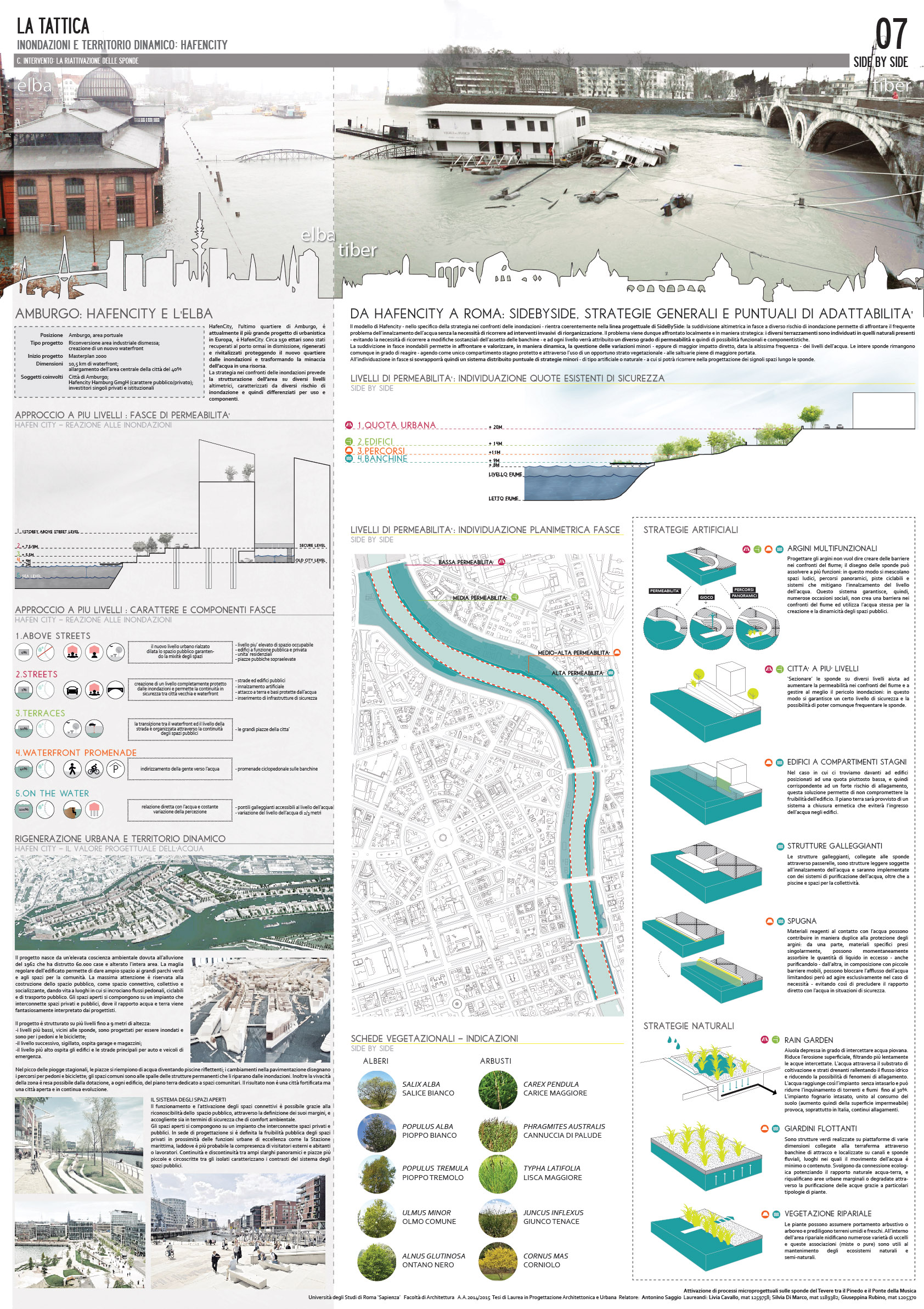 L’intero progetto Side by Side è supportato da tre ambiti teorici di studio: la recente esperienza della riqualificazione della Senna per l’organizzazione e la fattibilità dei progetti lungo le sponde dal forte carattere sociale, promossi con un'intelligente sinergia tra energie ed economie generate dal basso e la generale volontà dell'Amministrazione; lo studio della Biomimetica per comprendere i processi naturali e la progettazione per cicli chiusi, particolarmente rilevanti in questo ambito naturalistico ed il caso studio di Hafencity ad Amburgo per analizzare il problema delle inondazioni e delineare alcune strategie risolutive .