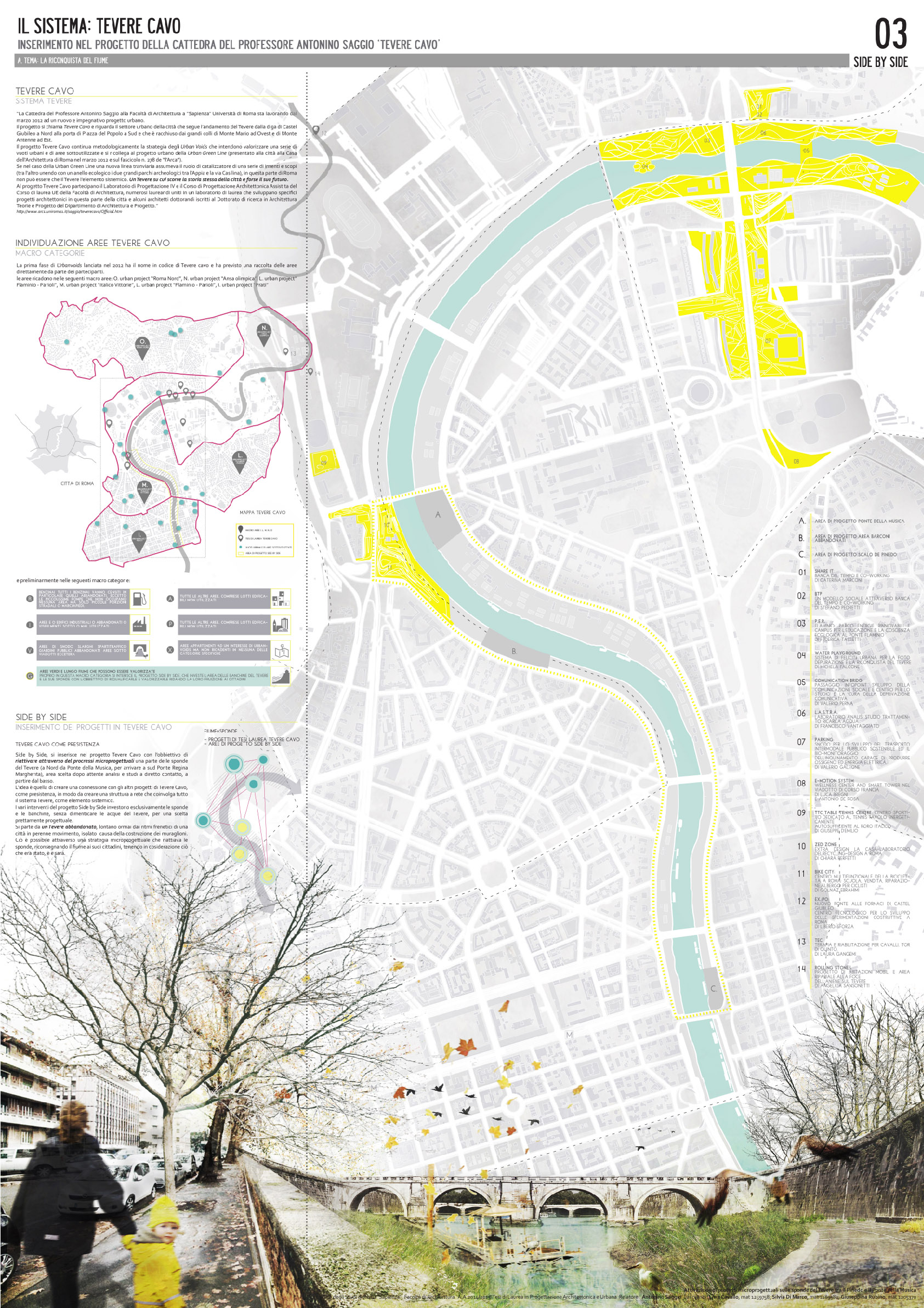 Side by Side nasce dal desiderio di riattivare e riconnettere un tratto delle sponde del Tevere, "da una sponda ad un’altra" tra il ponte della Musica a nord e lo scalo de Pinedo a sud con lo scopo di risollevare un Tevere ormai abbandonato e lontano dai ritmi della città. Se si percorre oggi questo tratto si troveranno barconi arenati sulle sponde o parcheggiati contro i muraglioni come balene ammarate, zone naturalistiche non percorribili, uno spazio urbano di grandi potenzialità come lo scalo de Pinedo preda del più totale degrado, la sottoutilizzazione delle zone adiacenti al nuovo ponte della Musica eccetera. E siamo al centro della capitale d'Italia.
