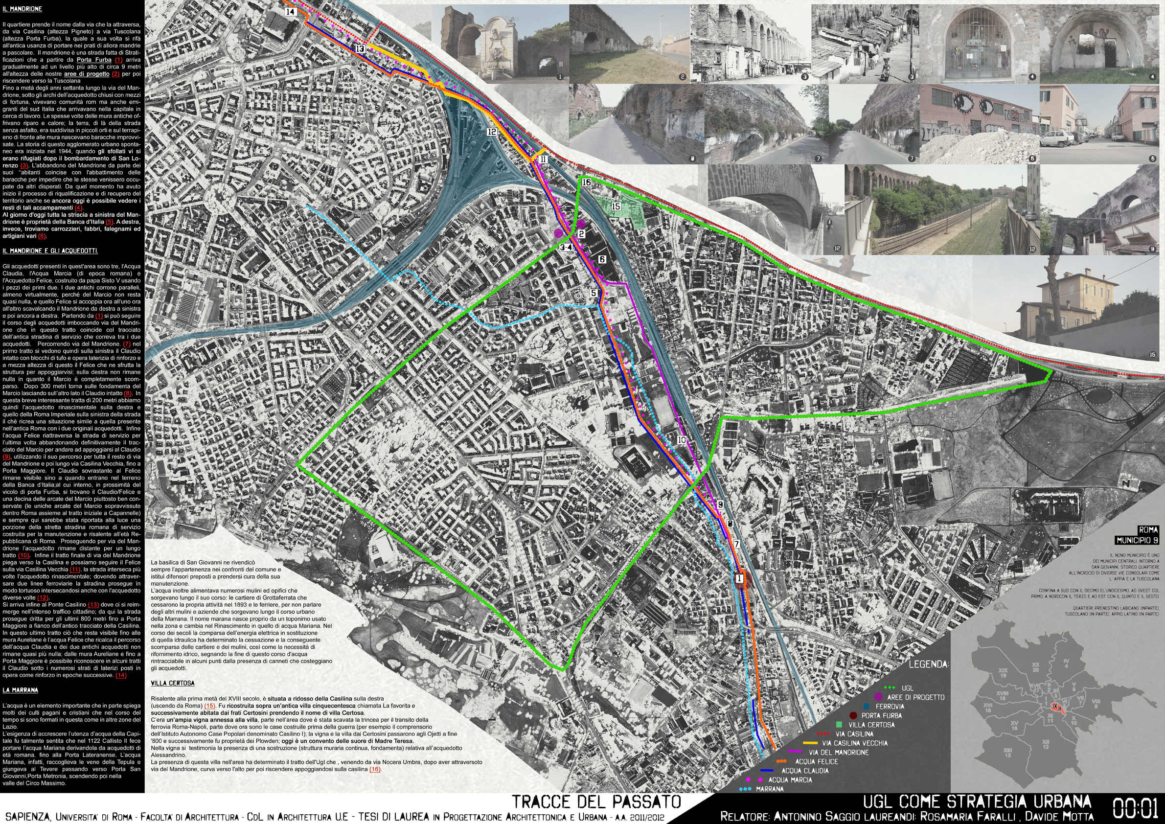 Questa tesi di laurea disegna con precisione gli andamenti di questo scavalcamento, individuando il necessario sfioccamento dei binari tranviari e il loro riammagliarsi nel tessuto della via Casilina. Il disegno nasce da una approfondita analisi delle forze morfologiche e delle giaciture dei diversi tessuti edilizi, delle stesse preesistenze archeologiche nel settore e dall’analisi della progressiva densificazione del suolo a partirte dal 1884. L’insieme della ricerca di informazioni converge progressivamente in una serie di operazioni diagrammatiche che determinano a poco a poco il campo possibile dell’andamento della infrastruttura. Allo stesso tempo questo campo di forze determina l’integrazione nel disegno complessivo dei due progetti architettonici all’interno del disegno dell’infrastruttura. In questo ambito è una forte originalità del progetto che disegna congiuntamente nodo infrastrutturale ed edifici. Il progetto di Rosamaria Faralli utilizza i vari livelli della scarpata per il Centro Kid Adult, e il progetto di Davide Motta per un Liceo artistico di nuova concezione che accompagnando e avvolgendosi nella urban green line diventa con l'infrastruttta quasi un'unica cosa. .