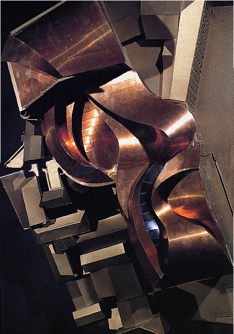 Nel progetto di tesi, il grande muro perimetrale salvato dalle fiamme rimane, consolidato ad arte, a contenere il teatro e a conservare le relazioni precedenti con la città. Ma sul muro si appoggiano fiamme di rame che coprono il teatro, raccontano le nuove spazialità interne e allo stesso tempo evocando il fuoco di quella notte.