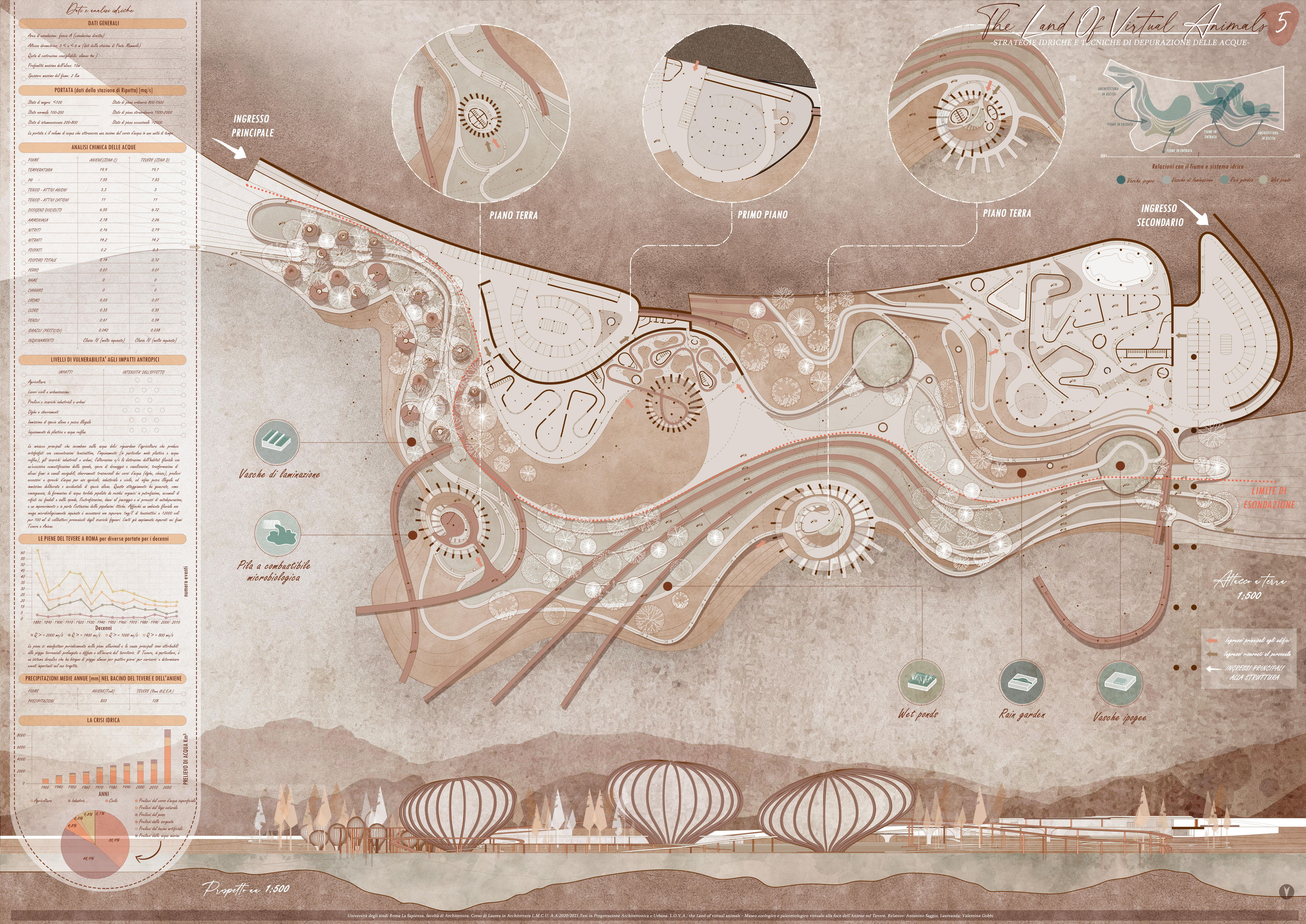 Il progetto è situato alla foce dell’Aniene sul Tevere ed ha come duplice scopo la riqualificazione architettonica ed urbana del primo tratto del fiume Aniene attraverso la realizzazione di un’infrastruttura slow ecosostenibile lungo la quale si collocano una serie di micro-installazioni. Ogni micro-installazione ospiterà diversi giochi ed attività alle quali l’utente potrà accedere con pagamenti in eco-monete ottenute attraverso baratto con attività sociali proattive e produttive. Gli ecoin vengono poi utilizzati come seconda modalità di accesso allo zoo ologrammatico e come ricompensa del superamento di alcune missioni da affrontare per potere accedere ai singoli edifici nell’area di progettazione.
