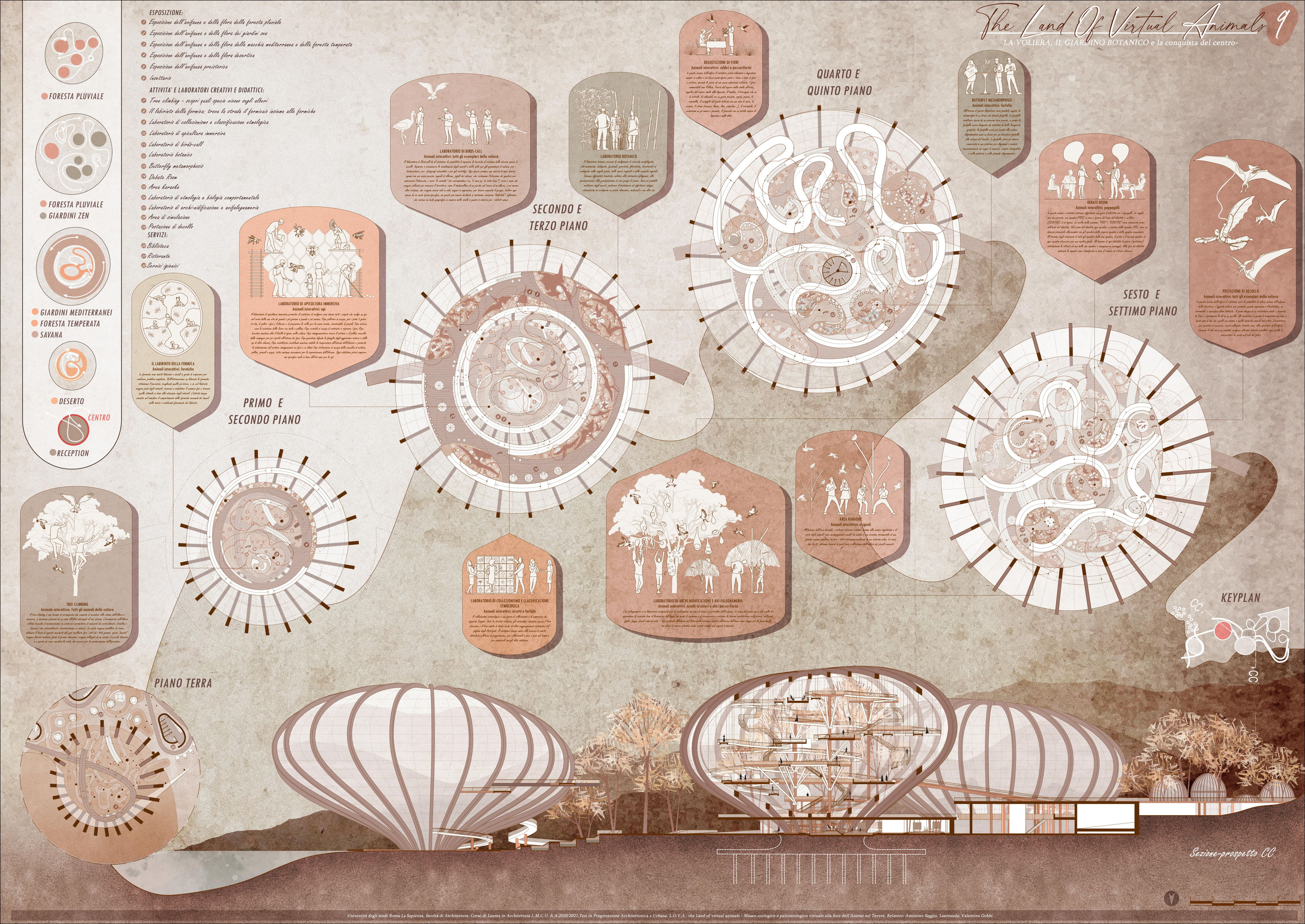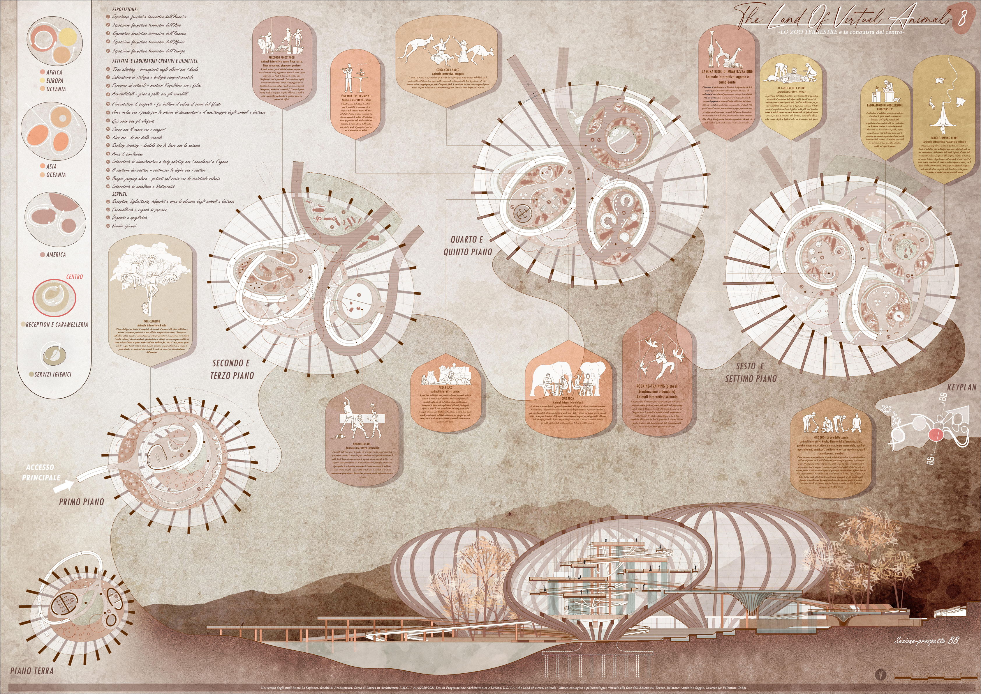 L’area di progettazione si compone in particolare di quattro edifici: lo zoo preistorico, lo zoo terrestre, l’acquario e la voliera con il giardino botanico. L’organizzazione funzionale interna è divisa in aree tematiche diverse per ogni edificio: habitat marini, continenti, biomi terrestri ed ere geologiche. Ad ognuna di queste zone corrispondono gli animali appartenenti a tali habitat con attività interattive ad essi associate.