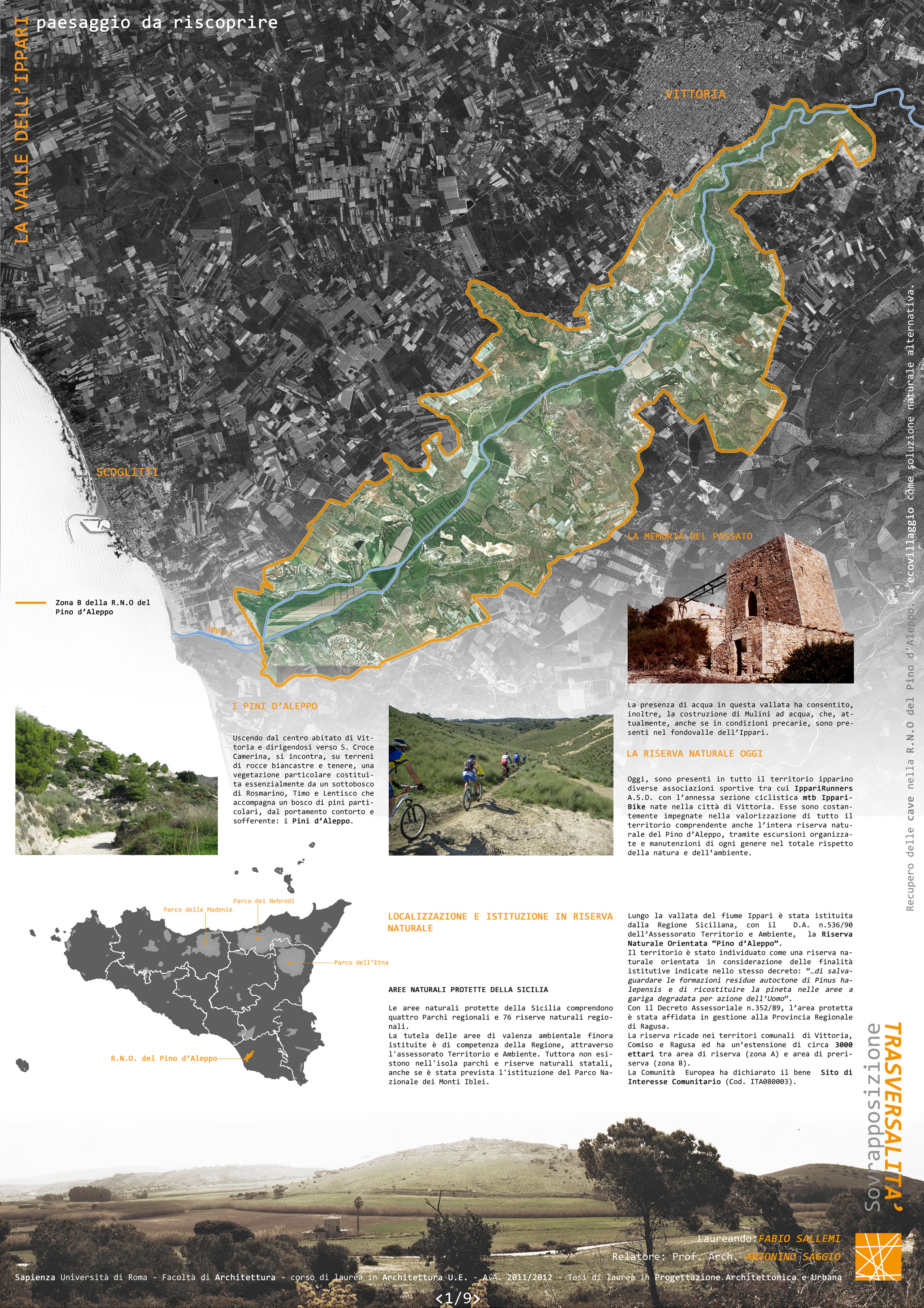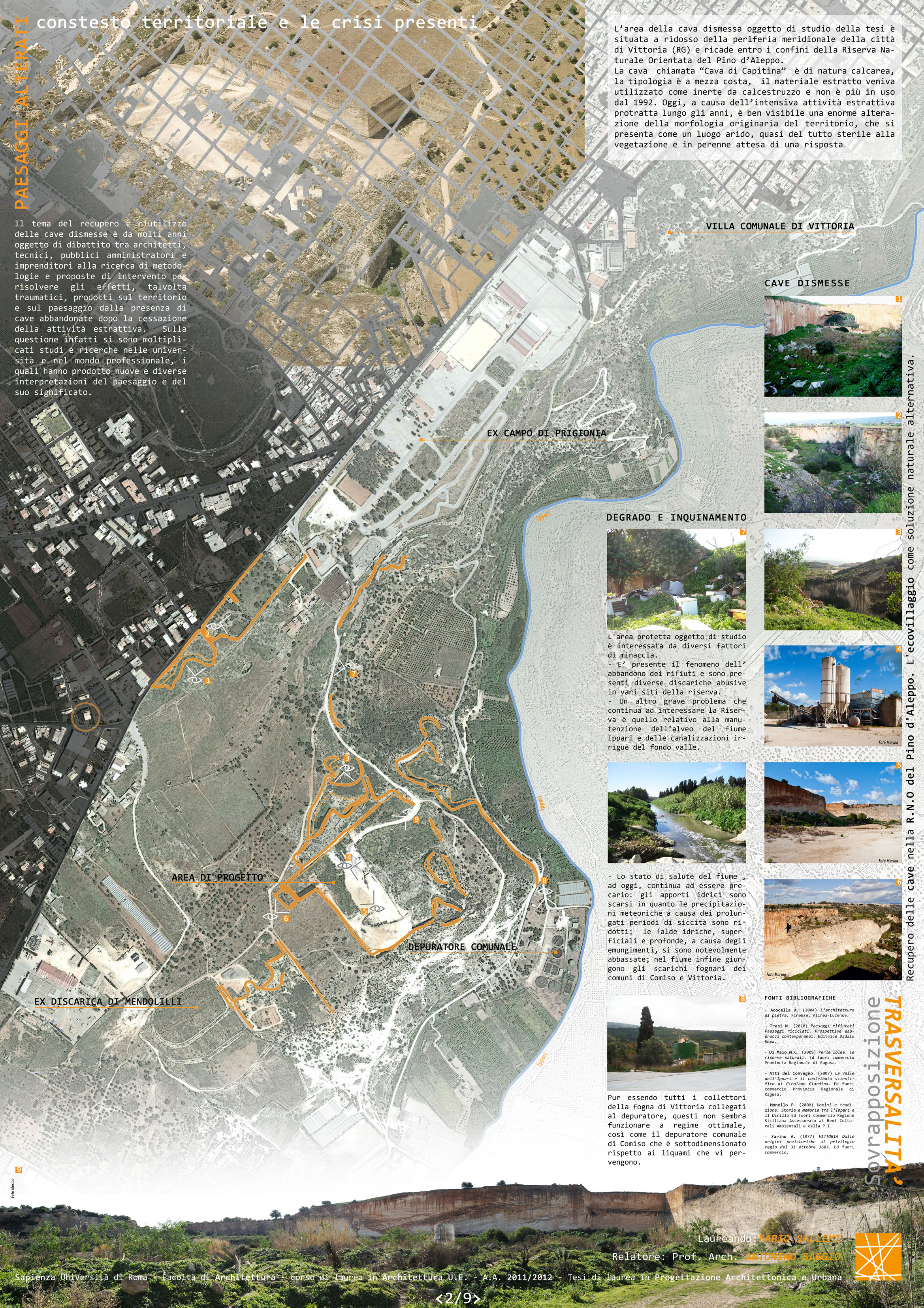 Il progetto nasce dalla necessità di valorizzare e tutelare le risorse naturali della riserva naturale del Pino d’Aleppo, sita nell’estremità sud-orientale della Sicilia. Dentro la riserva esiste una cava dismessa, situata a ridosso della periferia meridionale della città di Vittoria, nel ragusano. Il processo di salvaguardia ambientale della riserva non può non essere integrato e supportato da un intervento di recupero della cava.