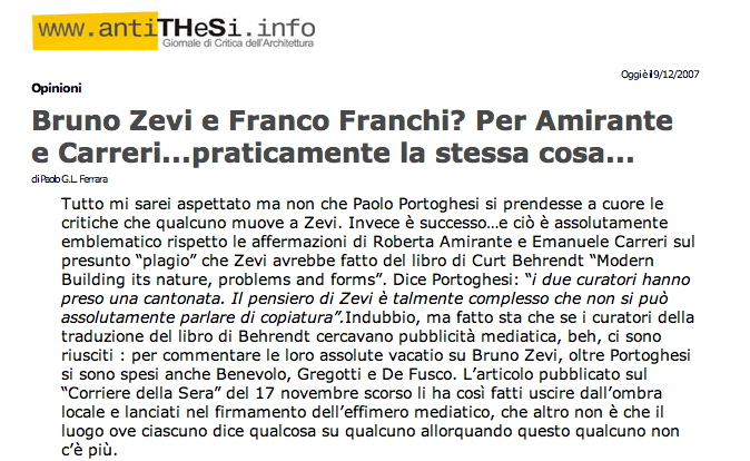 Pensavo, per rinfrescare la memoria, di youtubizzare un antico intervento su Zevi. Cercando sul web, trovo questo articolo di Paolo Ferrara. Ne sono felice, per un insieme di ragioni: per la bellezza giusta dell'articolo, che fa scadere nell'ininfluente quello del CdS e le allusioni al "dejà lù" , e soprattutto per l'articolo in sé e per sé: che è da leggere come una vera perla. Vi si combinano insieme informazioni, cultura, conoscenze filologiche e un moderato ma centrato sarcasmo. Una vera perla! In fondo questo è l'importante: che con Paolo e con "Antithesi" vivano alcuni caratteri e alcuni pezzi del Dna di "Verso un'architettura organica" (scritto nel 1944, in due settimane legato ad una sedia mentre cadevano le bombe a Londra.) L'articolo di Paolo, questo sì, è bello, è vivo, e dà fiducia. >