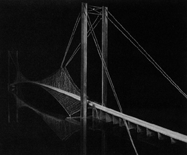 Il primo, più piccolo, è incernierato sulla base di appoggio e sorregge a mensola la prima parte della travatura, mentre il secondo - più grande - si impenna nello spazio ad ancorare gli stralli cui è appeso il secondo tratto della travatura. Le forme scultoree e l’equilibrio magico di forze interagenti coaugulate in questo schema statico rappresenta il marchio e il logo di Morandi e gli permette di portare a compimento incarichi prestigiosi per tutta l’arte italiana del costruire: il ponte di nove chilometri sulla laguna di Maracaibo in Venezuela all’inizio degli anni Sessanta, il viadotto sul Polcevera a Genova del 1964, il Ponte sul Wadi El Kuff in Libia completato nel 1971. Sono impetuosi interventi dell’uomo sulle grandi dimensioni della natura o della città di cui molto si tratta e si discute sul catalogo. Ma con lo stesso equilibrio di forze dà vita anche a piccoli episodi altrettanto calibrati e belli come il Viadotto sull’ansa del Tevere del 1965.