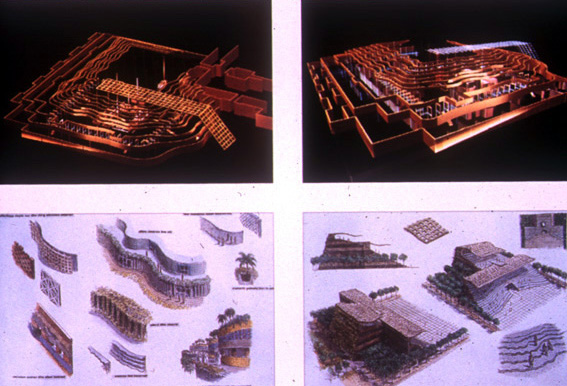 In California tantissimi operano su queste tematiche. Avete mai visto a come ultimamente i Morphosis, (per dire di un gruppo alla moda, ci sono appunto molti trentenni e quarantenni che vivono di queste cose), fanno i plastici? Sono plastici, e quindi sono anche architetture, che introiettano il paesaggio in se stesse, che diventano paesaggio. Sono curve di livello o onde trattate, non c'è neanche differenza tra come l'intorno e l'edificio sono fatti, e questo vuol dire una ricerca in cui il problema è di nuovo rimisurarci con la natura e con il problema del paesaggio come valore fondativo dell'architettura, come il problema dell'industria è stato valore fondativo del Bauhaus. Perché è la crisi cui siamo di fronte: se noi non ci rendiamo conto che questa è la crisi, che dobbiamo misurarci su questo e che gli anni a venire non possono non misurarsi su questa tematica, l'architettura diventa sorda, e noi non vogliamo che l'architettura sia sorda, ma dev'essere uno degli avamposti della riflessione intellettuale. Muoviamoci ancora un poco verso Est, e chi troviamo? Troviamo Soleri, un pioniere di questa problematica: fin dagli anni '60 tenta di realizzare un'architettura che dica questo, che faccia questo. Certo non ha i segni di questi architetti che noi sentiamo più vicini a noi, però il problema è questo, ed è un pioniere dell'eretico, ed è stato un eretico per questo, perché aveva cominciato a farlo trent'anni fa in questo suo piccolo studio con questi studenti con i sandali che venivano da tutta l'America per aiutarlo a creare.