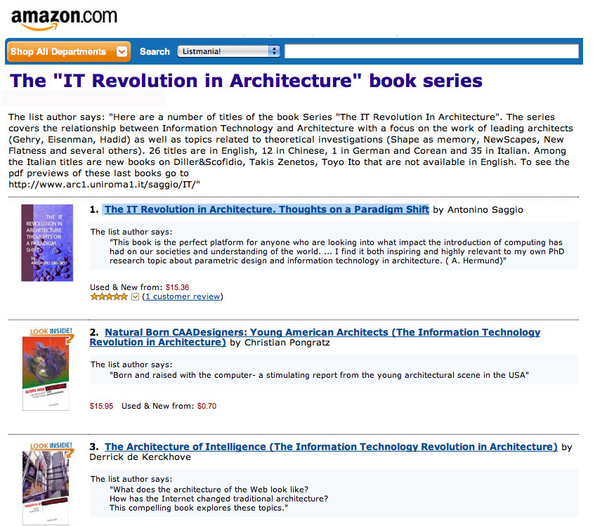 Eisenman along with Gehry is one of the USA´s most important living architects; de Kerckhove heads the McLuhan Program in Culture and Technology in Toronto; Saggio is Professor in Rome and editor of the series IT Revolution in Architecture.